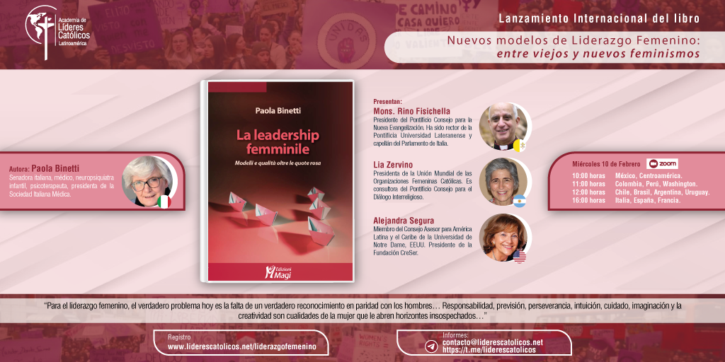 Este 10 de febrero la Academia de Líderes Católicas hará el lanzamiento mundial del libro ‘Nuevos modelos de liderazgo femenino: entre viejos y nuevos feminismos’, de la autora italiana Paola Binetti, que además de formar parte del equipo de formadores de esta instancia, es actualmente senadora por la Unión Demócrata de Centro.
