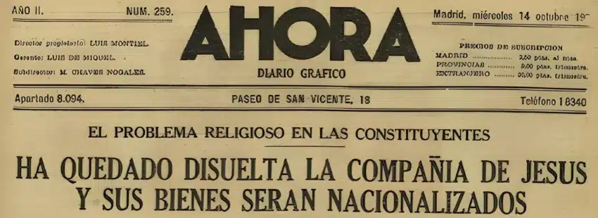Gracias a los compañeros de ‘Ahora visto hoy’, que han colaborado en este reportaje facilitándonos bastante más material del publicado a diario, nos encontramos con este llamativo titular de portada en su edición del 14 de octubre de 1931: “Ha quedado disuelta la Compañía de Jesús y sus bienes serán nacionalizados”. En el antetítulo se señalaba que “el problema religioso” llegaba a las Cortes Constituyentes, añadiendo en el subtítulo que “las demás órdenes religiosas no podrán dedicarse a la enseñanza” y que, “en un plazo de dos años, quedará extinguido el presupuesto de culto y clero”, perdiendo el clero toda dependencia económica del Estado.