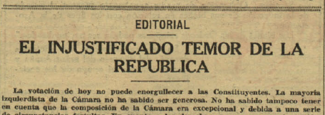 Más allá de la crónica como tal, en su línea centrista, el editorial de ‘Ahora’, que se titula ‘El injustificado temor de la República’, se muestra crítico con lo que entiende que es un exceso que tensiona a la sociedad. “La votación de hoy –se lamenta– no puede enorgullecer a las Constituyentes. La mayoría izquierdista de la Cámara no ha sabido ser generosa”. Entendiendo que se ha ignorado que su composición es “excepcional y debida a una serie de circunstancias fortuitas”, en pleno proceso constituyente, se echa también en cara a las derechas “su obcecación”, sufriendo ahora “las consecuencias de su abstencionismo suicida”, que “ha dejado libre el campo a los partidarios de las soluciones extremas”.