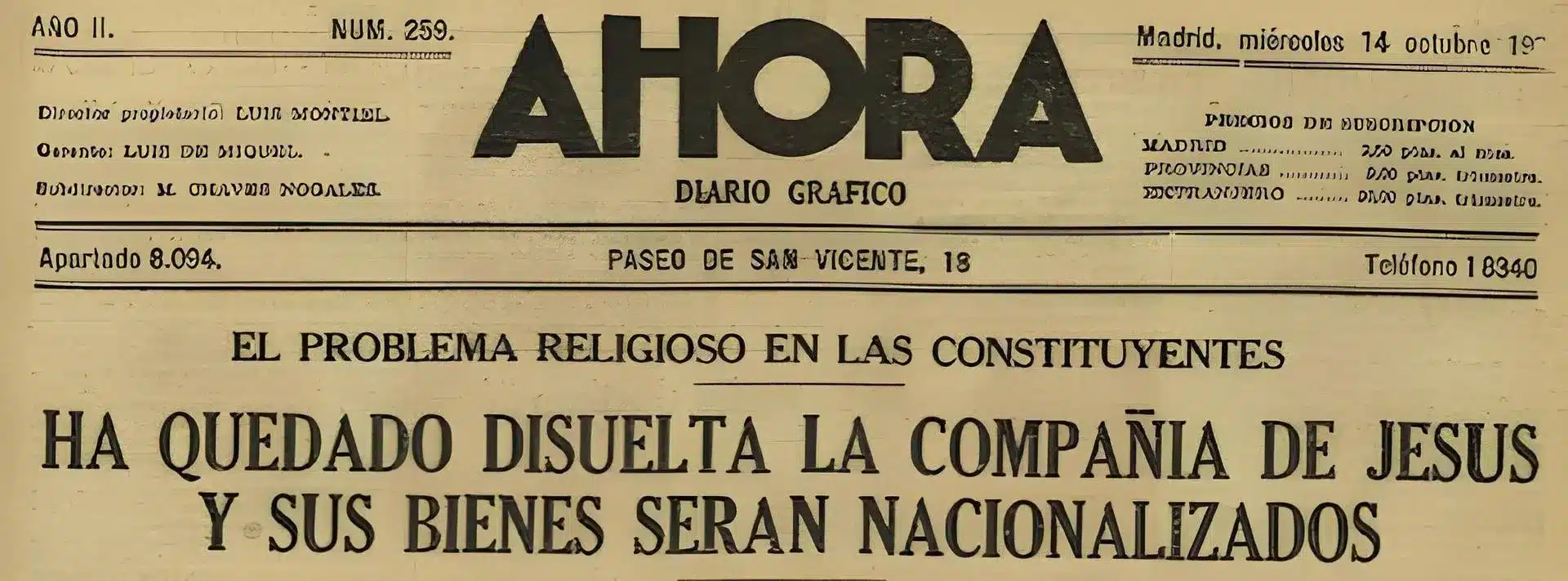Gracias a los compañeros de ‘Ahora visto hoy’, que han colaborado en este reportaje facilitándonos bastante más material del publicado a diario, nos encontramos con este llamativo titular de portada en su edición del 14 de octubre de 1931: “Ha quedado disuelta la Compañía de Jesús y sus bienes serán nacionalizados”. En el antetítulo se señalaba que “el problema religioso” llegaba a las Cortes Constituyentes, añadiendo en el subtítulo que “las demás órdenes religiosas no podrán dedicarse a la enseñanza” y que, “en un plazo de dos años, quedará extinguido el presupuesto de culto y clero”, perdiendo el clero toda dependencia económica del Estado.