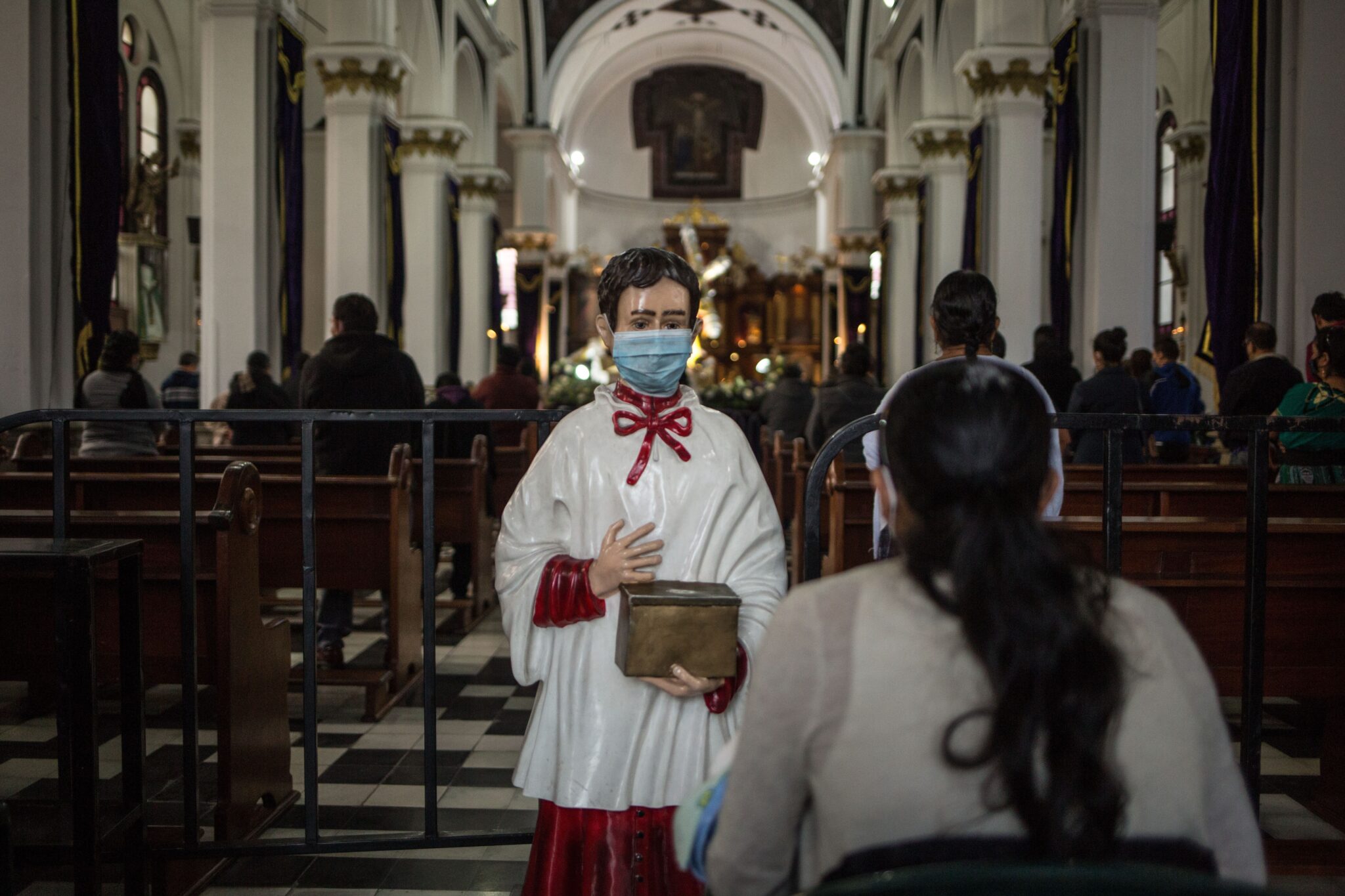 (((ACTUALIZA INFORMACIÓN)))AME6418. CIUDAD DE GUATEMALA (GUATEMALA), 17/02/2021. Feligreses cátolicos participan en la misa del Miércoles de Ceniza en la Catedral Metropolitana en el Centro de la Ciudad de Guatemala. En Guatemala debido al Covid-19 los sacerdotes dejan caer ceniza sobre los feligreses en lugar de dibujar la cruz en la frente para evitar el contacto. EFE/ Esteban Biba