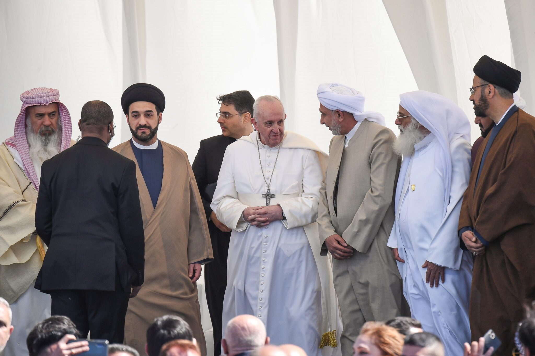 A las once de la mañana -las nueve en España- se habían reunido a 200 metros del majestuoso zigurat erigido en el segundo siglo antes de Cristo a Nannar, dios sumerio de la luna representantes de las religiones existentes en este país. La variedad de los atuendos era digna de verse. El Papa fue acogido con aplausos y después de un impresionante canto de varios pasajes del Corán presentaron su testimonio dos muchachos, un musulmán y un cristiano, una mujer de la religión sabea mandea y un anciano seguidor de Mahoma. Todos pidieron a Bergoglio que rezara por la paz en Irak y que “por fin la convivencia entre todos llegue a realizarse”.