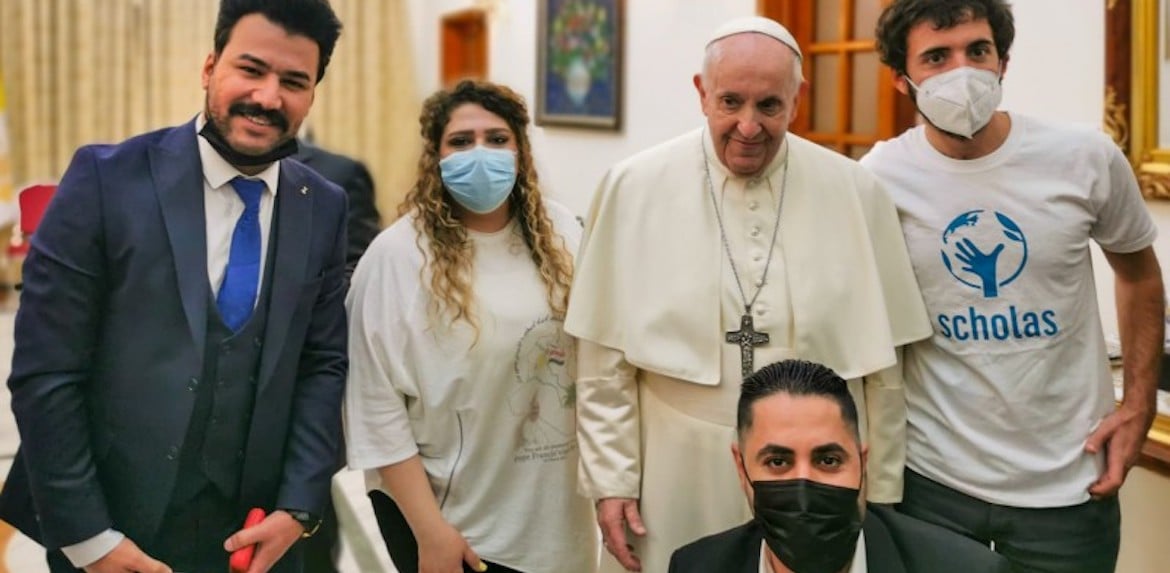 El equipo de Scholas Occurrentes ha acompañado al papa Francisco en su viaje a Irak. De esta manera, el Santo Padre se reunió con Scholas y un grupo de jóvenes iraquíes ayer, 5 de marzo, en la Nunciatura de Bagdad, para inaugurar la Escuela de Deportes por la Paz promovida por esta institución creada por Francisco. El proyecto cuenta, además, con el apoyo del Ministerio de Juventud y Deportes de Irak y la Liga de Fútbol Profesional de España, quienes ya están desarrollando un programa para implementar el fútbol base en Irak.
