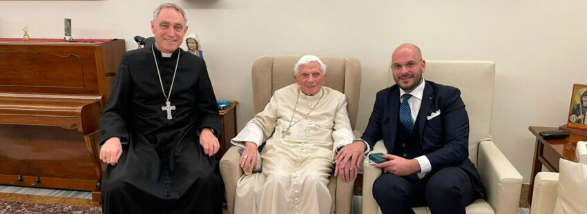 Benedicto XVI reaparece. El papa emérito ha posado sonriente en una audiencia privada ayer, 15 de marzo, con Lorenzo Festicini, presidente del Instituto Nacional Azzuro. Junto a su inseparable secretario personal, George Gänswein, se le ve buen aspecto cuando justo queda un mes para que cumpla 94 años (16 de abril).