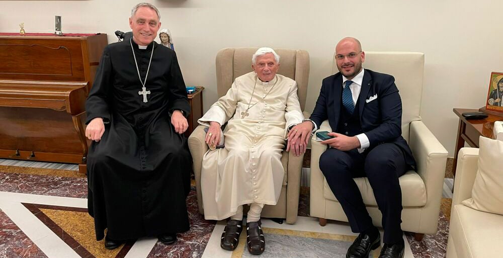 Benedicto XVI reaparece. El papa emérito ha posado sonriente en una audiencia privada ayer, 15 de marzo, con Lorenzo Festicini, presidente del Instituto Nacional Azzuro. Junto a su inseparable secretario personal, George Gänswein, se le ve buen aspecto cuando justo queda un mes para que cumpla 94 años (16 de abril).