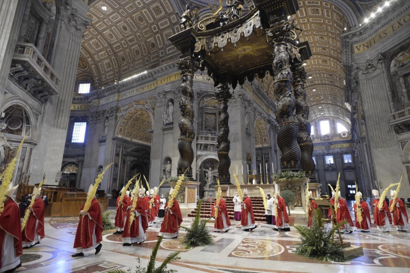 Esta celebración Conmemoración de la entrada del Señor en Jerusalén y santa misa con las que comienza la Semana Santa ha incluido la bendición de los ramos junto al altar mayor de cara a la nave central de la basílica, la proclamación del relato de la pasión según san Marcos y un recuerdo hacia los jóvenes en las peticiones –aunque el papa Francisco ha desplazado a la fiesta de Cristo Rey las jornadas diocesanas de la juventud–. El aforo de la basílica, previsto para unas 20.000 personas, fue de 120 fieles ante el altar diseñado por Bernini.