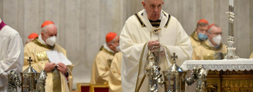 Tras el paréntesis del año pasado, el papa Francisco, junto con una representación del consejo presbiteral de la diócesis de Roma, así con diferentes fieles, ha presidido esta mañana de Jueves Santo la Misa Crismal en la Basílica de San Pedro. Los sacerdotes, durante las celebración, han renovado sus promesas sacerdotales y el pontífice ha consagrado el crisma y bendecido los Santos Óleos como marca la tradición. Debido a la reducción del aforo la eucaristía se ha celebrado en el altar de la Cátedra de san Pedro y se ha simplificado la procesión con los óleos, estando las ánforas con estos situadas frente al altar desde el inicio de la celebración.