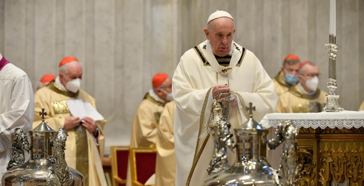 Tras el paréntesis del año pasado, el papa Francisco, junto con una representación del consejo presbiteral de la diócesis de Roma, así con diferentes fieles, ha presidido esta mañana de Jueves Santo la Misa Crismal en la Basílica de San Pedro. Los sacerdotes, durante las celebración, han renovado sus promesas sacerdotales y el pontífice ha consagrado el crisma y bendecido los Santos Óleos como marca la tradición. Debido a la reducción del aforo la eucaristía se ha celebrado en el altar de la Cátedra de san Pedro y se ha simplificado la procesión con los óleos, estando las ánforas con estos situadas frente al altar desde el inicio de la celebración.