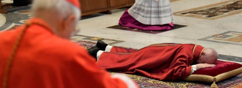 Una año más, el silencio y la sensación de vacío en la basílica de san Pedro en la tarde del Viernes Santo ha sido algo más que un gesto ritual. La celebración, con el mínimo de gente necesaria para desarrollar la liturgia y una pequeña representación de fieles, comenzó a las seis de la tarde, con el templo a media luz, y el papa Francisco postrado en el suelo en señal de penitencia y adoración sin cantos y con vestiduras rojas frente al crucifijo cubierto.