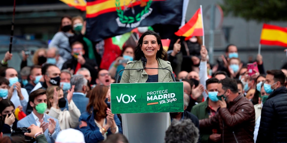 GRAF7973. MADRID, 19/04/2021.- La candidata de Vox a la presidencia de la Comunidad de Madrid, RocÌo Monasterio, durante el acto electoral que el partido celebra hoy lunes en la Plaza de la ConstituciÛn de Fuenlabrada, con vistas a las elecciones autonÛmicas madrileÒas del prÛximo 4 de mayo. EFE/Kiko Huesca