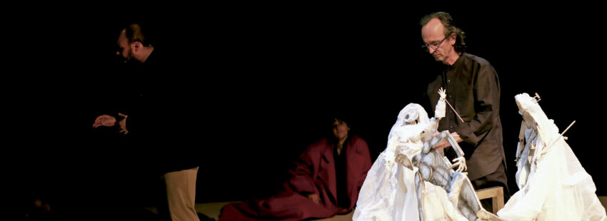 Descendimiento ocupa desde el 8 de abril –y hasta este domingo, día 25– el Teatro de La Abadía, en Madrid. Y sí, como Marquerie pretendía, no es una obra de teatro, ni siquiera una dramatización barroquista, menos aún un recital, sino todo un encuentro, casi un rito, en el que confluyen tres actores –Fernanda Orazi, Emilio Tomé y Lola Jiménez–, con el Niño de Elche en directo junto a los músicos Clara Gallardo y Joaquín Sánchez Gil, y el propio Marquerie con sus marionetas.