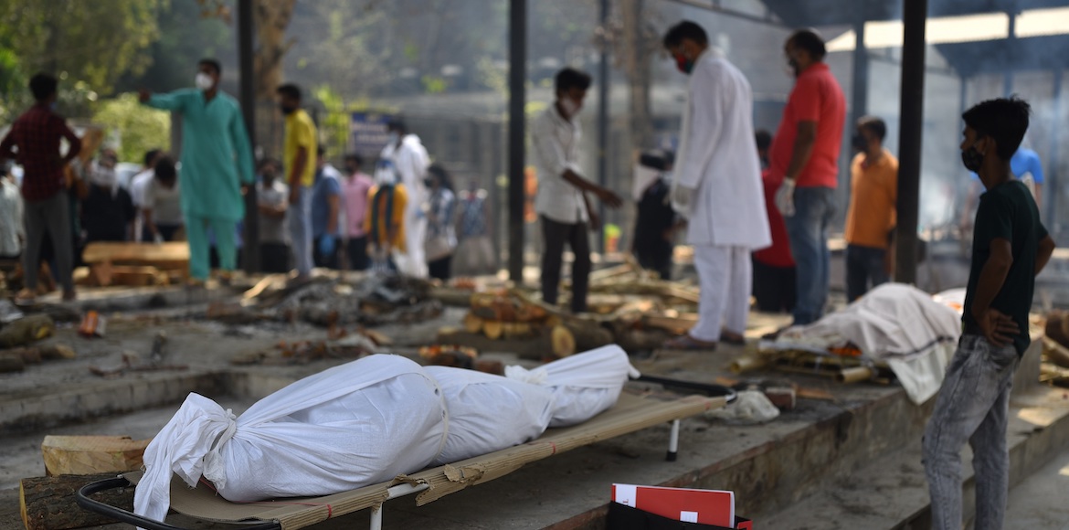 New Delhi (India), 27/04/2021.- Relatives wait next to the bodies to be cremated at the cremation ground in New Delhi, India, 27 April 2021. The WHO Chief Tedros Adhanom Ghebreyesus told reporters that the situation in India is beyond heartbreaking after India recorded a massive surge of 332,730 fresh Covid-19 cases and 2,771 deaths, the highest single-day spike in COVID-19 infections and also struggling with the oxygen supply. (Nueva Delhi) EFE/EPA/IDREES MOHAMMED