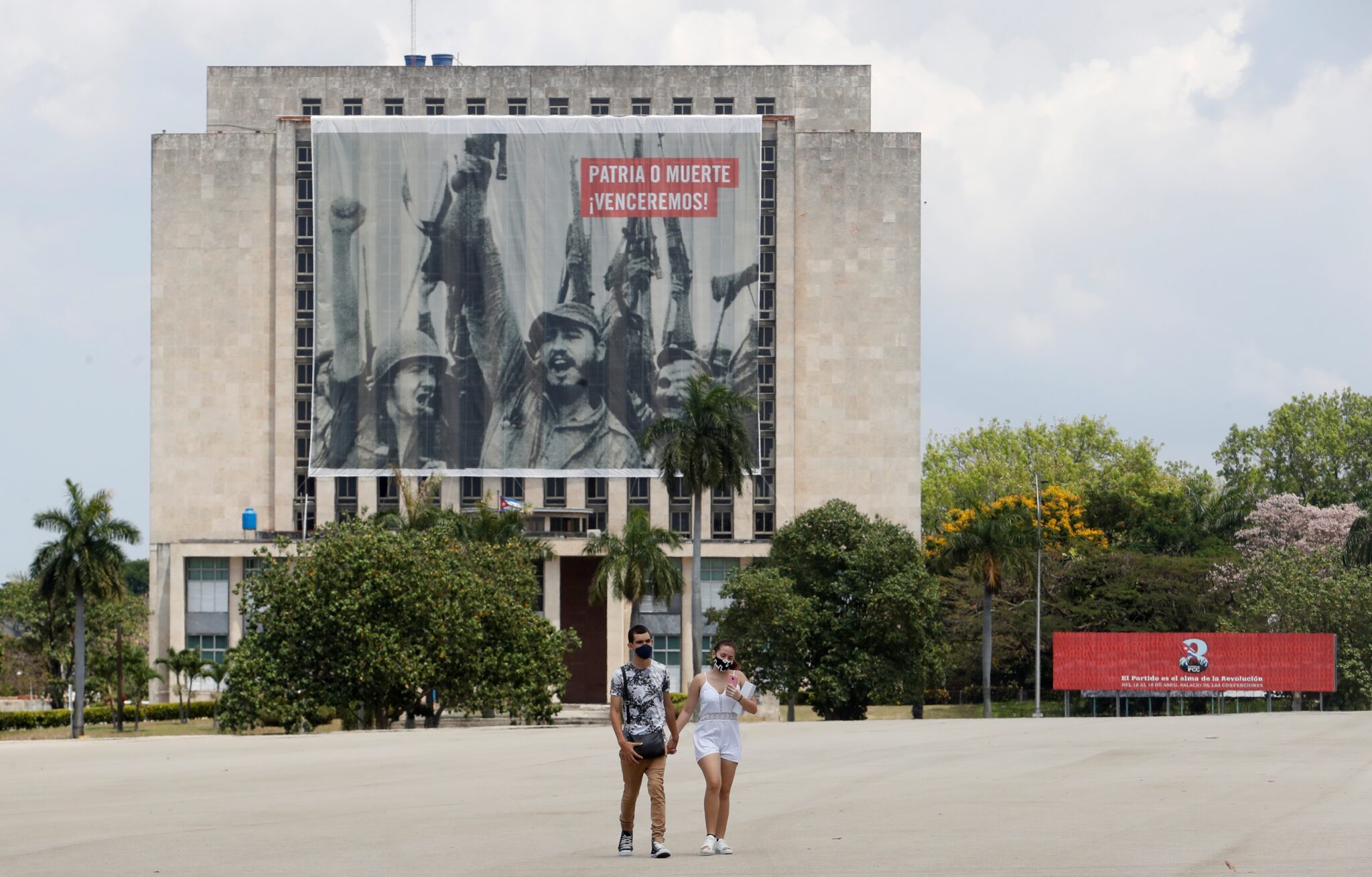 AME4168. LA HABANA (CUBA), 01/05/2021.- Una pareja camina por la Plaza de la Revolución, sede de la tradicional marcha de los trabajadores, hoy, en La Habana (Cuba). Este año la marcha fue suspendida a causa de la pandemia de la covid-19. EFE/Yander Zamora