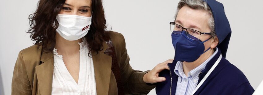 La actual presidenta de la Comunidad de Madrid, Isabel Díaz Ayuso, ha votado esta mañana en el colegio La Inmaculada-Marillac, donde se ha detenido a saludar a una de las consagradas del centro, perteneciente a las Hijas de la Caridad.