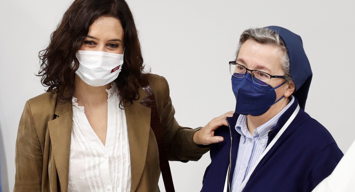 MADRID, 04/05/2021.- La presidenta de la Comunidad de Madrid, Isabel DÌaz Ayuso, saluda a una religiosa en el colegio La Inmacualada-Marillac a donde ha acudido para ejercer su derecho al voto en Madrid, este martes. Un total de 5.112.658 personas est·n llamadas a votar en las elecciones autonÛmicas de Madrid de este 4 de mayo, de las cuales 4.783.528 residen en la regiÛn, una jornada electoral que estar· marcada por las medidas de protecciÛn contra el coronavirus y por las consecuencias de los resultados no sÛlo en la comunidad autÛnoma sino tambiÈn a nivel nacional. Son unas elecciones singulares en la regiÛn al ser las primeras que se celebran por adelantado y las segundas que tienen lugar en dÌa laborable tras las de 1987, aunque no habr· clase en los centros no universitarios. EFE/ Chema Moya