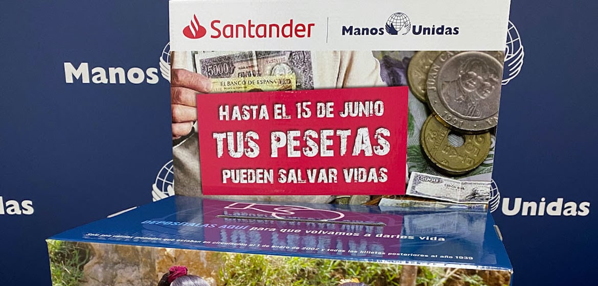 Banco Santander y Manos Unidas han iniciado una campaña conjunta bajo el lema ‘Tus pesetas pueden salvar vidas’ con el objetivo de recoger pesetas que aún quedan en circulación para cambiarlas por euros y destinar la recaudación a alguno de los proyectos solidarios que cada año apoya la ONG de la Iglesia Católica.