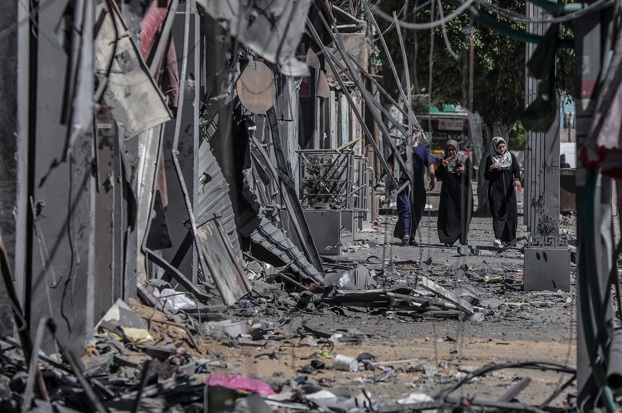 Gaza (-), 18/05/2021.- Palestinians walk among rubble of a destroyed building after, after israeli airstrikes in Gaza City, 18 May 2021. In response to days of violent confrontations between Israeli security forces and Palestinians in Jerusalem, various Palestinian militants factions in Gaza launched rocket attacks since 10 May that killed at least 12 Israelis to date. The Palestinian health ministry said that at least 213 Palestinians, including 61 children, were killed in the retaliatory Israeli airstrikes. (Atentado, Estados Unidos, Jerusalén) EFE/EPA/MOHAMMED SABER
