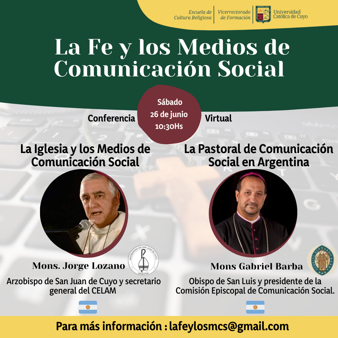 La Escuela de Cultura Religiosa de la Universidad Católica de Cuyo, en forma conjunta con Meraki, Comunicación y Liderazgo y Vivamos Juntos la Fe, invitan a un ciclo de conferencias sobre la fe y los medios de comunicación.