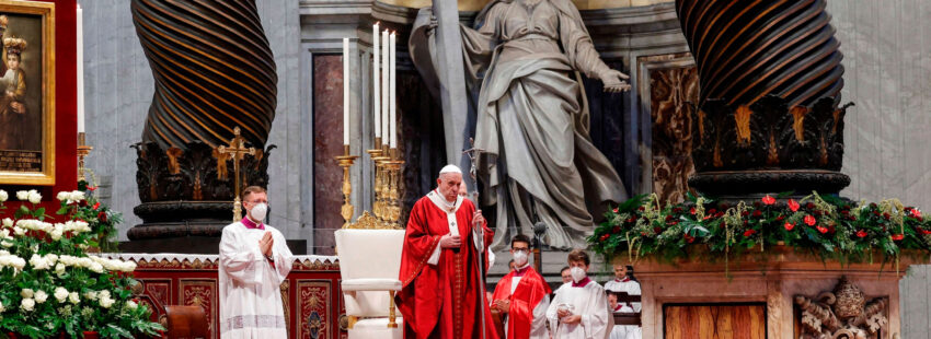Pese a las restricciones debido a la pandemia del coronavirus, la basílica de San Pedro del Vaticano vivió este martes el ambiente de las grandes ceremonias con la celebración de la misa en la solemnidad de los apóstoles san Pedro y san Pablo, antes de la cual el papa Francisco bendijo los palios destinados a los arzobispos metropolitanos nombrados en todo el mundo a lo largo del año, a los que se impondrá esta estola, confeccionada con lana de cordero y símbolo de su unidad con Pedro, en sus respectivas sedes de manos de los nuncios apostólicos. La ceremonia fue concelebrada por un nutrido grupo de cardenales y obispos, entre ellos varios españoles.