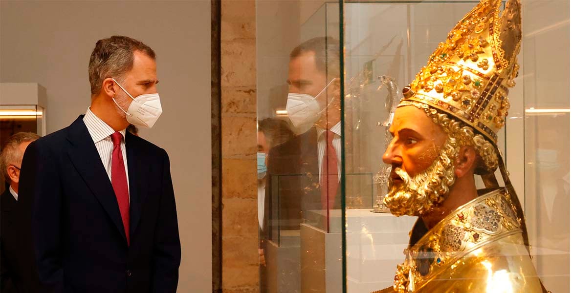El Rey llegó a la plaza del Rey Fernando en torno a las 11:30 h. de la mañana de este martes, 29 de junio. En el interior de la seo burgalesa puso contemplar las 120 piezas de patrimonio religioso relacionado con las catedrales que se presentan en esta muestra en Burgos. La exposición se complementa con otras dedicadas a la Virgen María en el Camino de Santiago en las otras dos sedes a las que el monarca no ha acudido –para cabreo del alcalde de Carrión de los Condes que dio plantón a Felipe VI no acudiendo al acto de este martes–.
