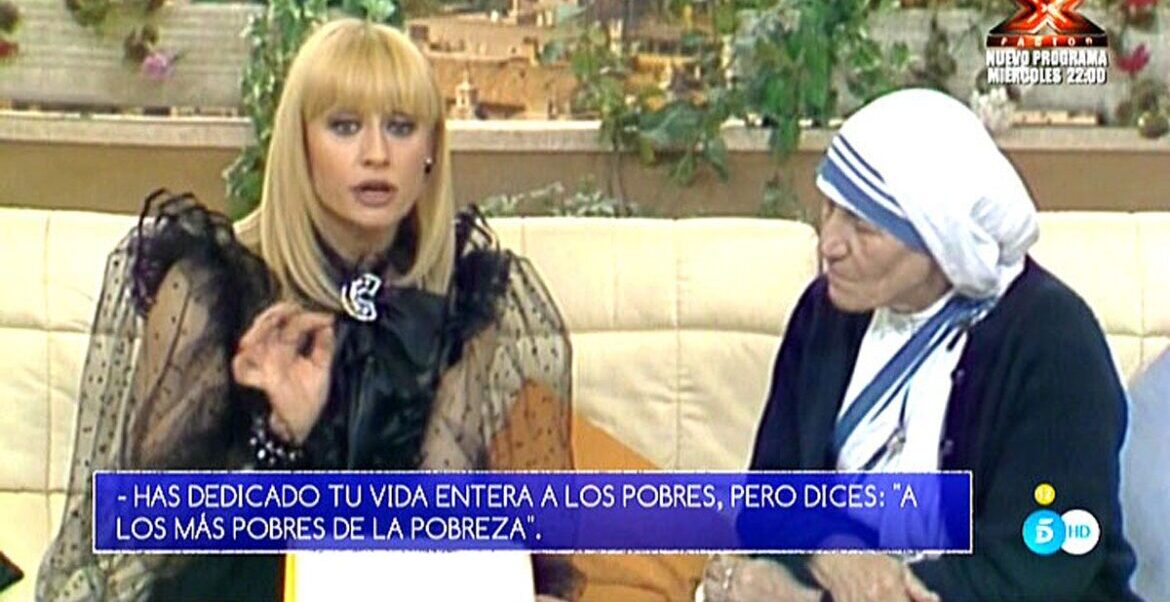 Ella, la diva de forma y humilde de fondo, iba repleta de ‘brilli-brilli’ para recibir a la madre de los olvidados. “Ese día llevaba un vestido negro con mangas transparentes bastante llamativas y dos brazaletes con incrustaciones de Swarovski. No había tiempo para cambiar y quién sabe qué pensó la Madre Teresa cuando me vio tan bien vestida … Además, hablaba inglés con una voz muy débil y yo estaba aterrorizado de no entender nada”. En ese momento, se encomendó a lo más alto: “Recuerdo que me volví hacia mi ángel de la guarda: ‘Por favor, ayuda a este pobre infeliz’”. Debió haberme escuchado porque, no sé cómo, entendí todo lo que me dijo”. La entrevista acabó con las dos rezando, a petición de la presentadora, “por todos los pobres del mundo.