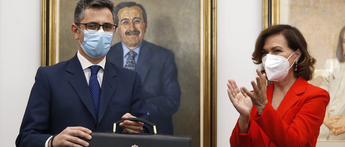 MADRID, 12/07/2021.- El nuevo ministro de la Presidencia, Relaciones con las Cortes y Memoria Democr·tica, FÈlix BolaÒos (i), recibe la cartera ministerial de manos de su antecesora en el cargo, Carmen Calvo, en un acto celebrado este lunes en Moncloa. EFE/Javier LizÛn