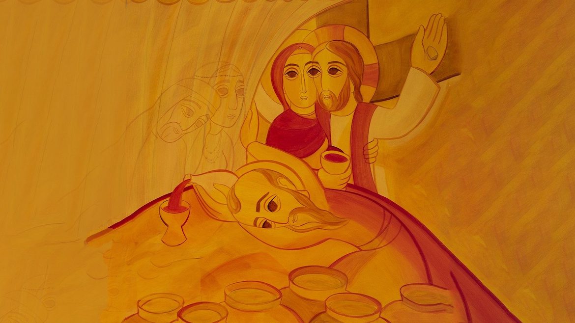 El título de la obra es ‘Este es un gran misterio’, haciendo alusión a la carta de san Pablo a los Efesios (5,32). En ella, se muestra así cómo el amor sacramental en el matrimonio es reflejo, a su vez, del amor indisoluble entre Cristo y la Iglesia. Y es que, tal como ha apuntado Rupnik, “en Caná, en la transformación del agua en vino se abren los horizontes del sacramento, es decir, del paso del vino a la sangre de Cristo. Pablo está derramando, de hecho, la misma sangre que la Esposa recoge en el cáliz”.