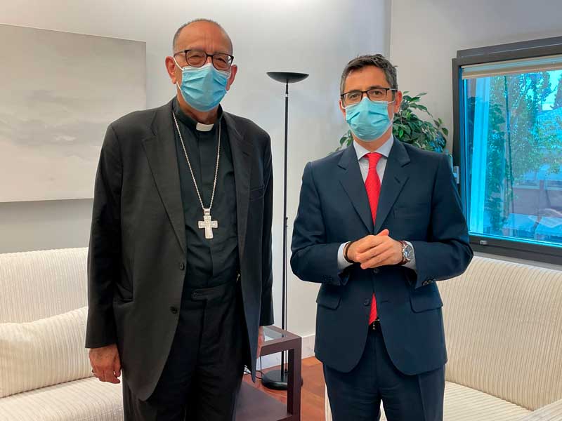 El ministro de la Presidencia, Relaciones con las Cortes y Memoria Democrática, Félix Bolaños, se ha reunido a las 12:30 h. de este martes, 3 de agosto, con el presidente de la Conferencia Episcopal Española, el arzobispo de Barcelona Juan José Omella. Una cita que se ha producido en la sede del Ministerio en el complejo del palacio de La Moncloa y se ha desarrollado dentro de los encuentros que el nuevo ministro está manteniendo con las instituciones con las que se relaciona su Ministerio.