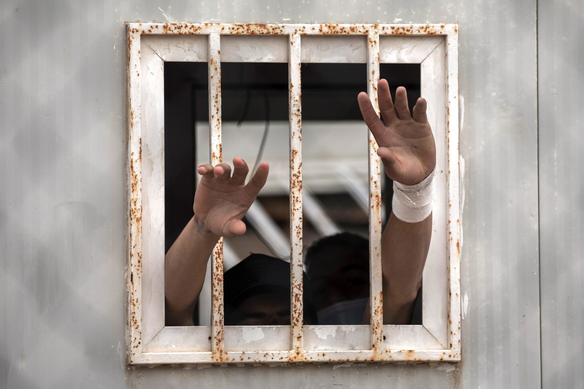 -FOTODELDÍA-. CEUTA, 20/05/2021.- Dos menores sacan sus manos por una ventana del albergue de Piniers, a donde han sido trasladados algunos de los 850 menores inmigrantes que permanecen en la ciudad española de Ceuta. La ciudad española de Ceuta, en el norte de África, recupera poco a poco la normalidad tras la llegada masiva de inmigrantes irregulares de estos días procedentes de Marruecos, mientras que las autoridades se centran ahora en la atención de los 850 menores de edad que permanecen en territorio español. EFE/ Brais Lorenzo