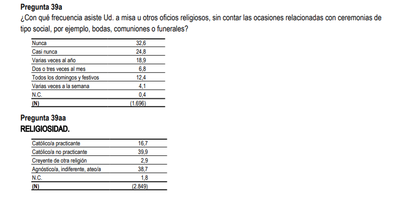 La pérdida de fe se hace más visible en los más jóvenes, pues entre los 18 y los 34 años el 62,05% se reconoce como no creyente. Al mismo tiempo, los que se declaran católicos en esta franja de edad rozan el 31%, con un porcentaje de practicantes del 8% y no practicantes del 23%. Según se avanza en edad crece el número de católicos tanto practicantes como no practicantes. La cifra mayor se encuentra en los mayores de 65 años, cuando los practicantes llegan al 46% y los no practicantes al 28%.