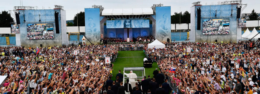 El estadio Lokomotiva de Kosice, construido en 1959, en la actualidad solo es utilizado para partidos de fútbol de la segunda división eslovaca. Puede albergar al máximo 10.000 espectadores, pero esa cifra se ha duplicado para el encuentro de los jóvenes eslovacos con el Papa, pues la mitad se agolpaban en el propio césped. Caluroso y entusiasta ha sido el recibimiento que han dispensado a Francisco cuando ha hecho su ingreso en el recinto a las cinco de la tarde a bordo de su papamóvil.