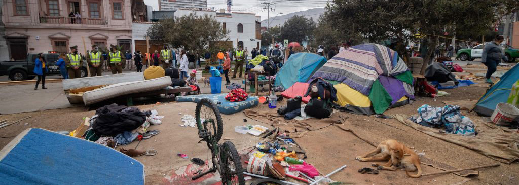 La policía llegó a la Plaza Brasil, de Iquique, a desalojar de ese lugar a unas 130 familias de inmigrantes, la mayoría venezolanos. El gobierno argumenta que ya había informado que tomaría esta medida. Así lo explico el Ministro del Interior, Rodrigo Delgado: “El desalojo de esta plaza y de otros lugares es porque no está permitido utilizar los espacios públicos, que tienen fin de esparcimiento y recreación, para poner sus viviendas transitorias” y agregó que fue “algo que se había advertido y hoy se está concretando”.