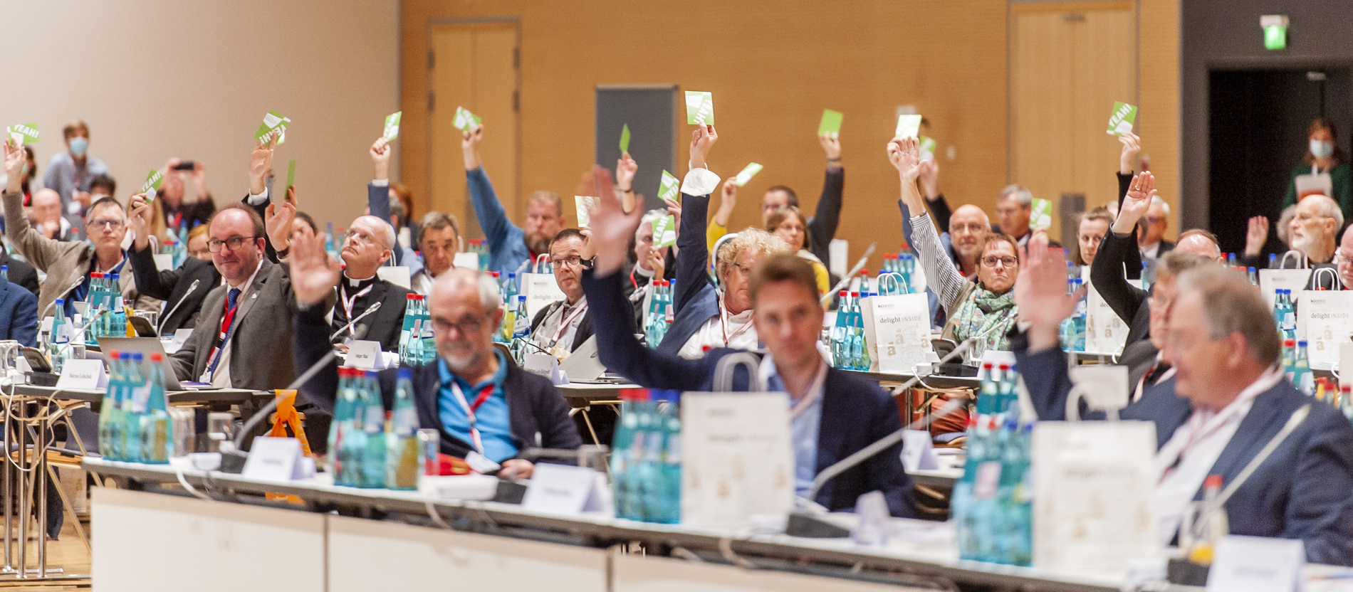 Deutschland, Hessen, Frankfurt, 30.09.2021 - Zweite Synodalversammlung des Synodalen Weges Eine Abstimmung mit Handzeichen auf der Zweiten Synodalversammlung FOTO: Synodaler Weg / Maximilian von Lachner