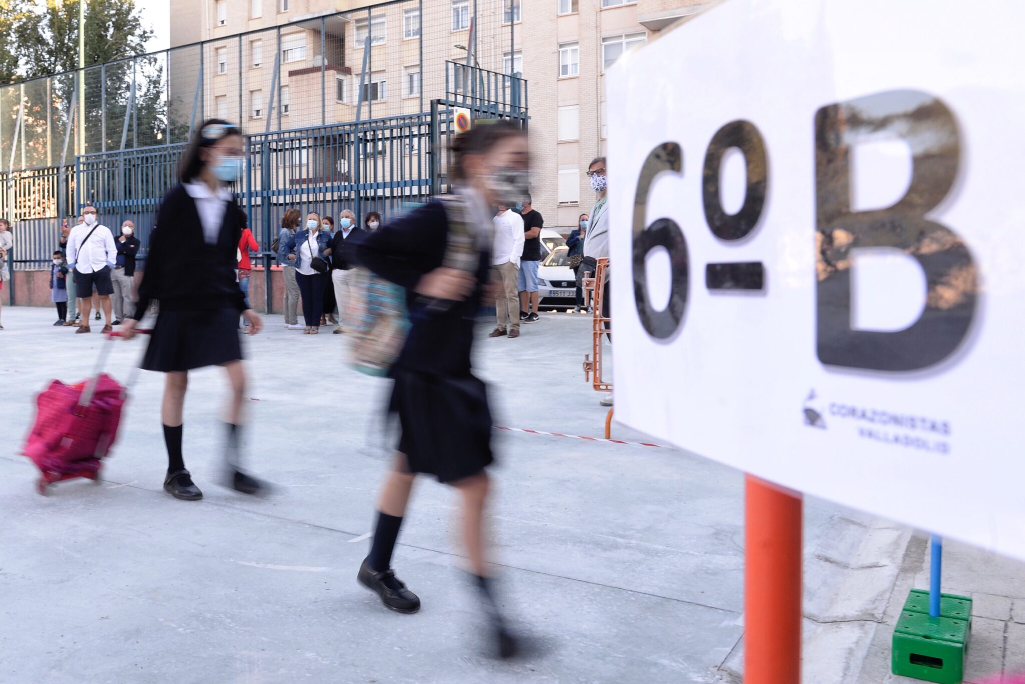-FOTODELDIA- GRAF1821. VALLADOLID, 09/09/2020.- Alumnos del Colegio Corazonistas de Valladolid durante su primer día de clase del curso 2020-21, en medio de un escenario de incertidumbre debido a la pandemia del coronavirus, el temor de los padres y madres por la salud de sus hijos, y un protocolo de seguridad elaborado por la administración autonómica en coordinación con las autoridades sanitarias y sustentado por un aumento de docentes en casi un millar. . EFE/NACHO GALLEGO