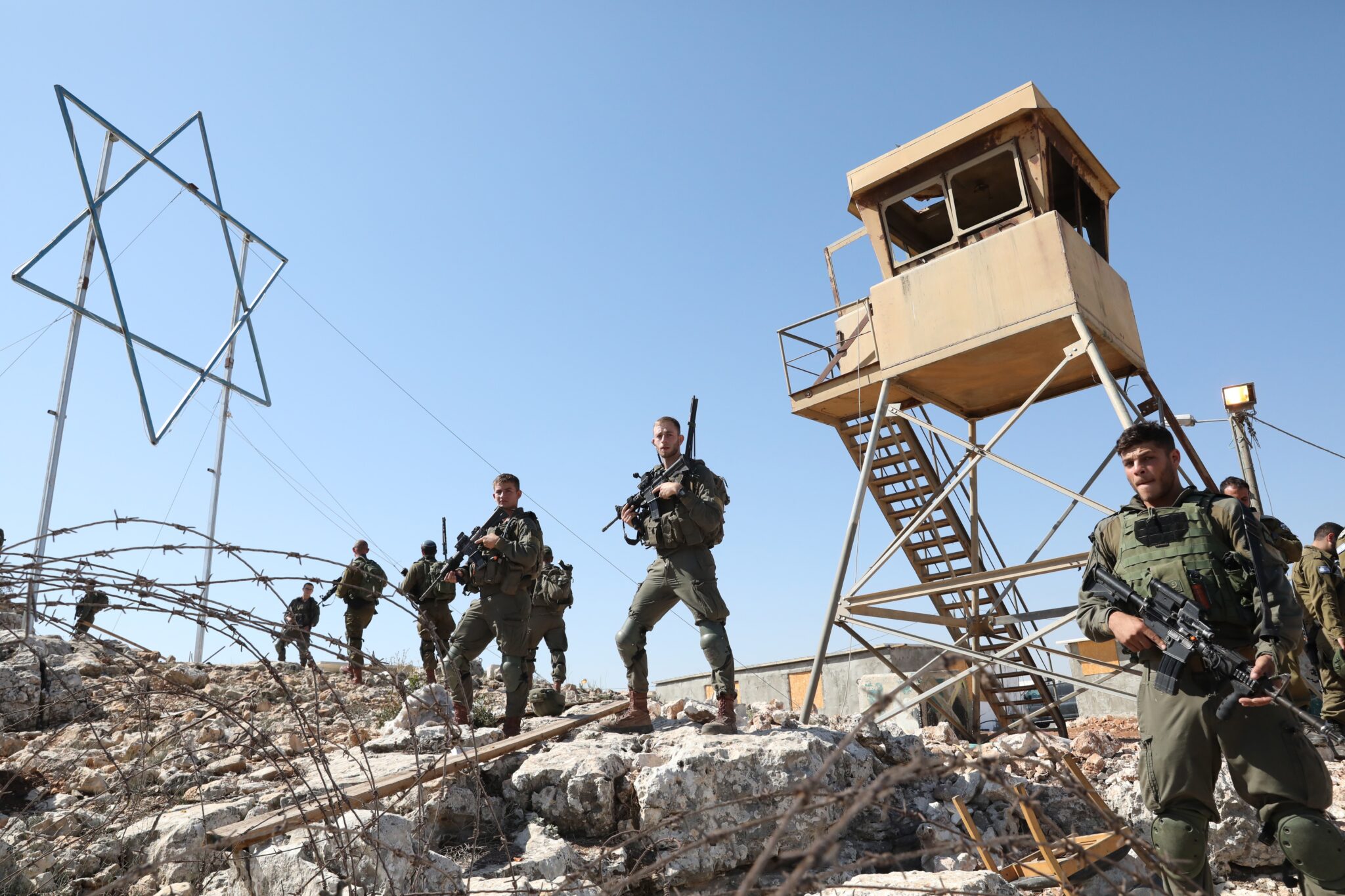 Nablús, 10/10/2021.- Soldados israelíes montan guardia mientras los voceros y manifestantes ayudan a los agricultores palestinos a recoger sus aceitunas junto al puesto de avanzada israelí de Evitar, cerca de la aldea de Beita, cerca de la ciudad de Nablus, hoy 10 de octubre de 2021. Voluntarios y activistas palestinos y extranjeros recogen aceitunas en solidaridad con los palestinos cuyas tierras fueron confiscado por colonos israelíes EFE/EPA/ALAA BADARNEH