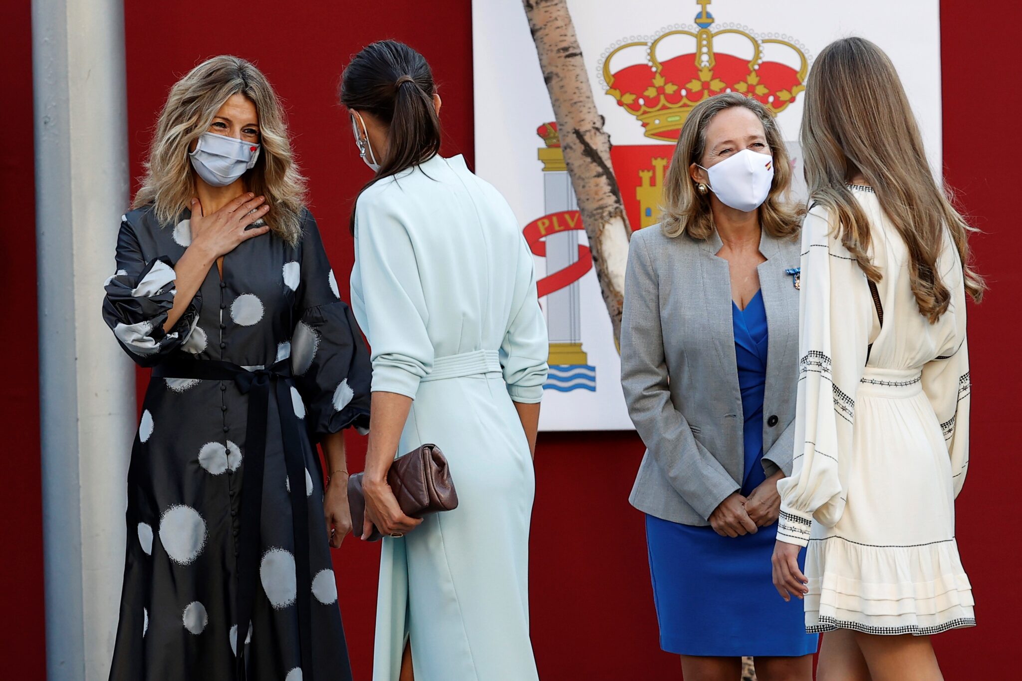 MADRID, 12/10/2021.- La ministra de Trabajo Yolanda Díaz, la vicepresidenta primera Nadia Calviño, la reina Letizia y la Infanta Sofía, asisten al desfile militar del 12 de Octubre en el Paseo de la Castellana de Madrid para festejar este martes el Día de la Fiesta Nacional. EFE/Chema Moya