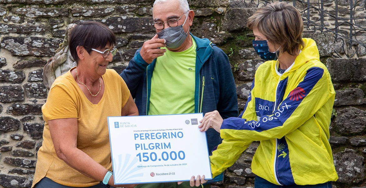 Marie Boileau, una mujer francesa de 68 años que, junto a su marido, ha realizado el Camino de Santiago cinco veces se ha convertido en la peregrina de número 150.000 de este Año Santo Compostelano. La peregrina ha recibido una placa conmemorativa de manos de la directora de Turismo, Nava Castro, y del delegado de peregrinaciones de la Catedral, Segundo Pérez, en el Centro Internacional de Acogida al Peregrino. Esta cifra consolida las previsiones de la Xunta de Galicia que espera acabar en 2021 con 200.000 peregrinos habiendo recibido la Compostela.
