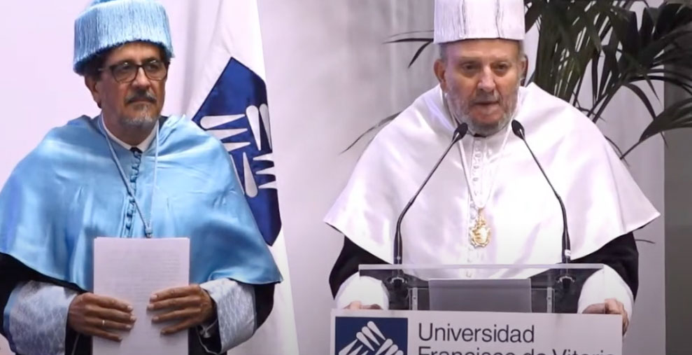 “Tenemos una batalla común que librar contra la bestia, la bestia que quiso Auschwitz, que sigue actuando en el mundo y que prepara un nuevo ataque contra la Iglesia y el pueblo judío, un terrible ataque de ateísmo, de negación de Dios”. Así se expresó ayer el iniciador del Camino Neocatecumenal, Kiko Argüello, en su discurso tras ser investido doctor honoris causa por la Universidad Francisco de Vitoria, junto al rabino David Rosen, por la contribución de ambos al diálogo judeo-católico.