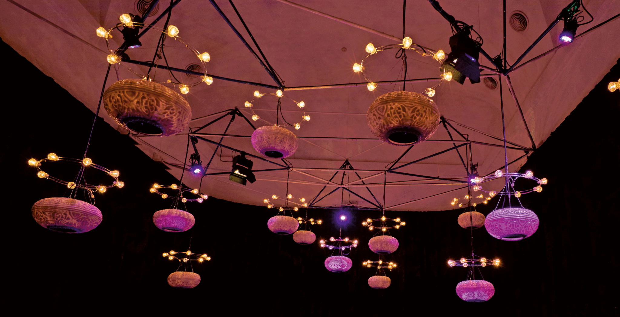 Catorce lámparas votivas esconden catorce altavoces en una sala completamente a oscuras, vestida, rodeada, de un telón negro. Por ellos se escuchan –mientras que la luz varía de color e intensidad– sonidos aparentemente fantasmagóricos, pero que se revelan “antiguos, primitivos, primigenios”, como los define Francisco Contreras (Elche, 1985), reconocido simplemente como Niño de Elche.