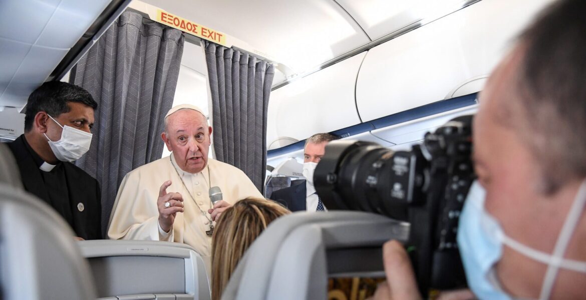 In Flight (Italy), 06/12/2021.- Pope Francis gives a news conference aboard the papal plane on his flight back to Rome after visiting Cyprus and Greece, 06 December 2021. (Papa, Chipre, Grecia, Italia, Roma) EFE/EPA/ALESSANDRO DI MEO / POOL