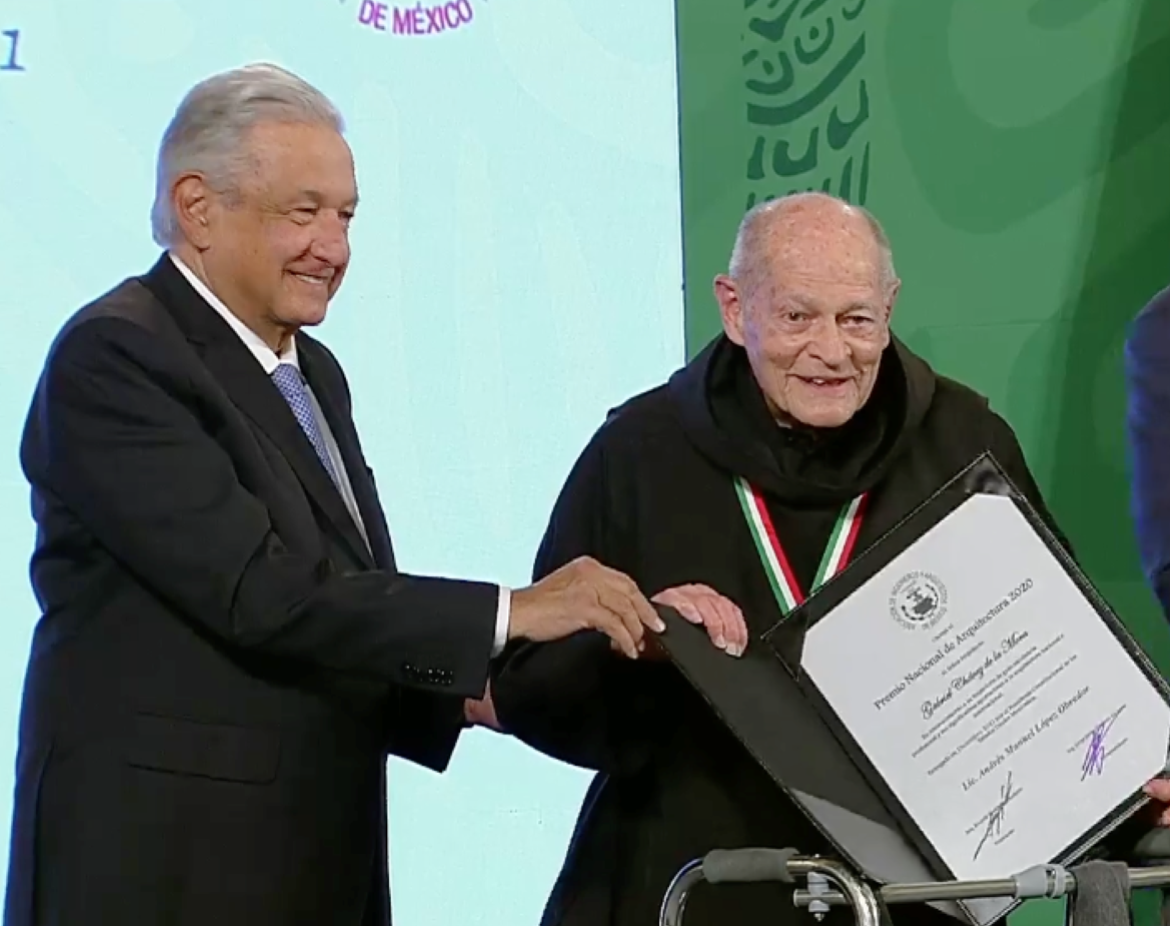 El presidente de México Andrés Manuel López Obrador entregó al religioso benedictino, fray Gabriel Chávez de la Mora el Premio Nacional de Arquitectura 2020 en el marco de la conferencia de prensa que el mandatario ofrece diariamente.