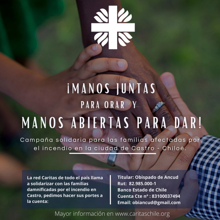 Ante la magnitud de la tragedia, el Obispado de Ancud llamó ayer viernes a colaborar con dinero en una cuenta corriente bancaria destinada para ese fin. El comunicado del obispado expresa que “la emergencia de las familias es hoy, pero su necesidad de apoyo será a mediano y largo plazo. Queremos contribuir con nuestro ‘grano de arena’ y acompañar por medio de la parroquia y sus organizaciones locales para que las familias se puedan ir levantando en medio de las cenizas”.