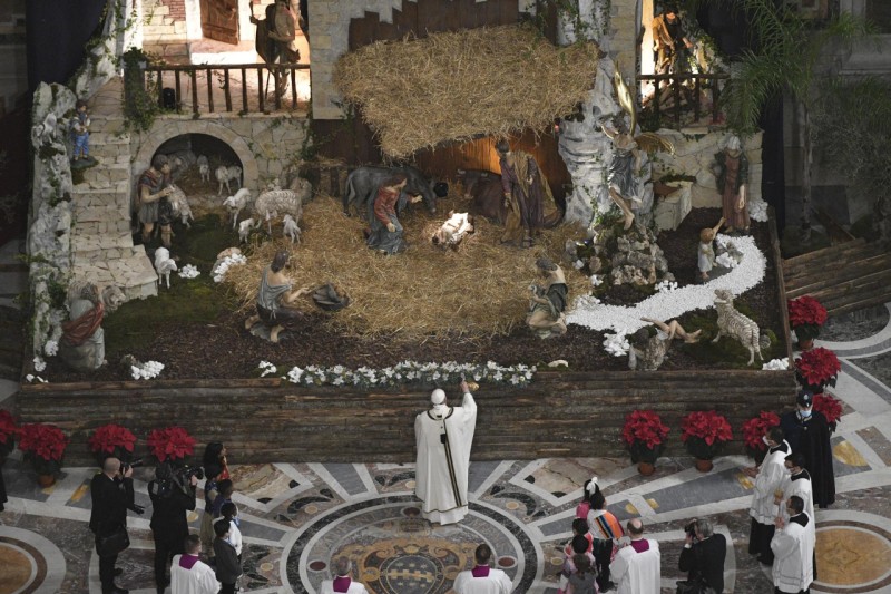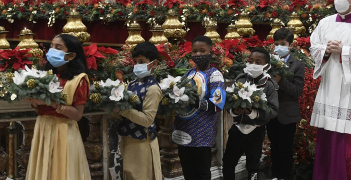 Una celebración concelabrada por un grupo de cardenales, obispos y unos 160 sacerdotes en la que se han mantenido ritos como el anuncio de la Navidad con el canto de la Calenda antes de la misa –este año dentro de un amplio momento de oración a partir de las indicaciones del Martilogio– o la veneración del Niño Jesús tras quitar el Papa el paño que lo cubría. Se han mantenido otros ritos propios como las colocación del libro de ls Evangelios junto a la imagen de Jesús o el hecho de arrodillarse en el Credo cuando se proclama el misterio de la Encarnación. Tan solo se ha omitido el gesto de la paz. Tras la ausencia del año pasado, han vuelto un grupo de niños –en esta ocasión de Italia, India, México, Congo y Cora– a participar en la procesión y en la ofrenda floral al Niño. También se ha colocado durante el canto del gloria la figura de Jesús en el belén peruano de la Plaza de San Pedro.