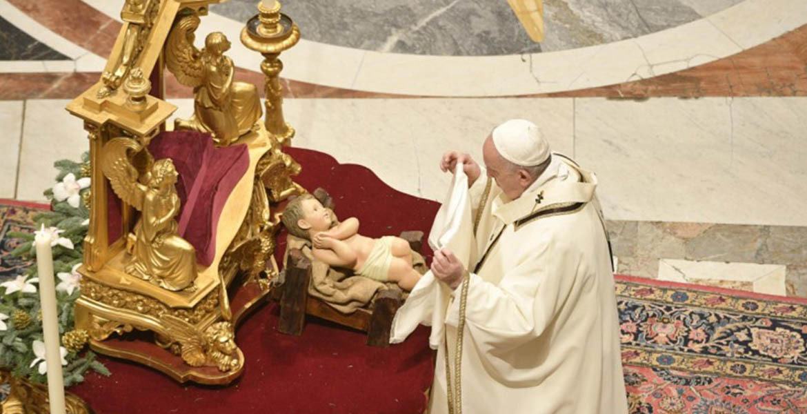 “Este es el mensaje: Dios no cabalga en la grandeza, sino que desciende en la pequeñez. La pequeñez es el camino que eligió para llegar a nosotros, para tocarnos el corazón, para salvarnos y reconducirnos hacia lo que es realmente importante”, recalcó el Papa. “Vayamos más allá de las luces y los adornos y contemplemos al Niño. En su pequeñez es Dios. Reconozcámoslo: ‘Niño, Tú eres Dios, Dios-niño’. Dejémonos atravesar por este asombro escandaloso”, añadió. Así, prosiguió Francisco, “Aquel que abraza al universo necesita que lo sostengan en brazos. Él, que ha hecho el sol, necesita ser arropado. La ternura en persona necesita ser mimada. El amor infinito tiene un corazón minúsculo, que emite ligeros latidos. La Palabra eterna es infante, es decir, incapaz de hablar. El Pan de vida debe ser alimentado. El creador del mundo no tiene hogar. Hoy todo se invierte: Dios viene al mundo pequeño. Su grandeza se ofrece en la pequeñez”.