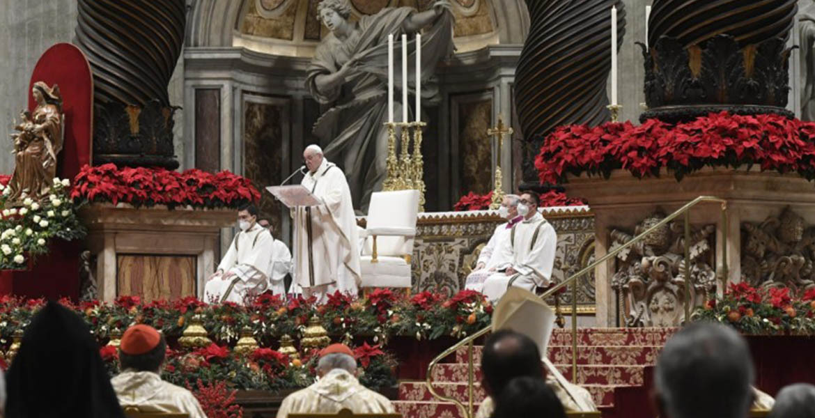 El papa Francisco ha presidido la eucaristía de Medianoche –la conocida como Misa del Gallo– de Navidad adelantada a las 19:30 h. por la situación sanitaria, ante un buen número de fieles en el altar de la Confesión de la Basílica del San Pedro. La de esta Nochebuena ha sido la primera celebración relativamente numerosa –aunque con distancia de seguridad– desde que empezara la pandemia del coronavirus. Una misa en la que se ha estrenado en las grandes celebraciones el nuevo maestro de las ceremonias pontificias, Diego Ravelli.