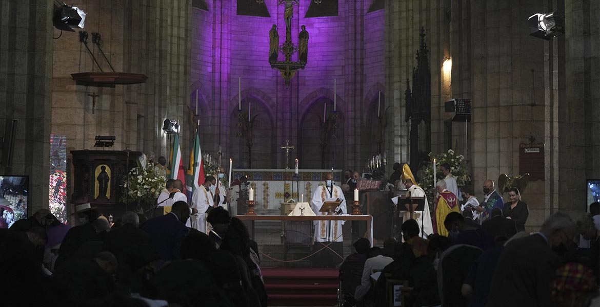 La histórica catedral de San Jorge –la iglesia anglicana más antigua del sur de África– ha acogido los funerales del arzobispo emérito que llegaba el jueves, 30 de diciembre escoltado por dos filas de clérigos (pastoral incluidas) anglicanos mientras la familia de Tutu acompañaba el ataúd. Muchos fieles han depositado velas en el templo. Por allí han pasado unas 2.000 personas el primer día y el 31 la cola ha llegado a alcanzar más de un kilómetro. En el templo, en el funeral, estaban la viuda del prelado, sus 4 hijos, 7 nietos y sus dos biznietos, así como un centenar de familiares junto a diferentes autoridades.