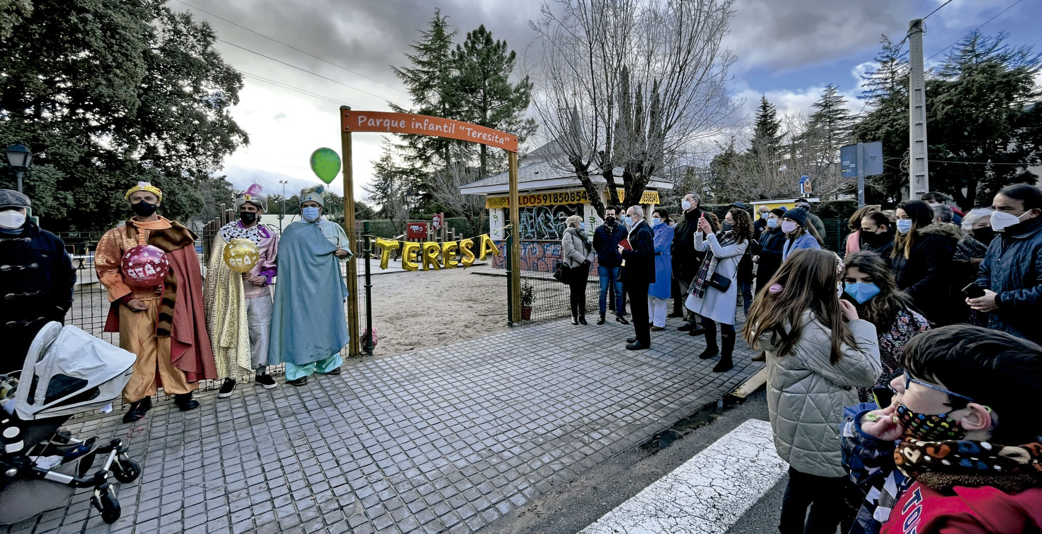 La puerta del antiguo parque de Los Arroyos de El Escorial iba llenándose de personas de todas las edades. Habían llegado hasta allí para recordar a la “niña misionera” y a celebrar que ese lugar que tanto le gustaba ahora lleva su nombre: Teresita. Entre los congregados estaba la familia de la pequeña, el párroco, Fernando Rey Ballesteros, que ha bendecido el parque, e incluso los pajes de los Reyes Magos, que soltaron unos globos y acompañaron al coro de la parroquia cantando villancicos.