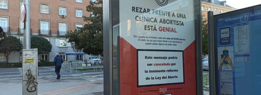 “Rezar frente a las clínicas abortistas está genial”. Centenares de marquesinas repartidas por 33 ciudades de toda España amanecían hoy con este provocador mensaje. En total, son 260 paneles instalados en calles y paradas de metro que ejercen de altavoz contra las próximas reformas de la Ley del Aborto y del Código Penal. Esta última prevé hasta un año de cárcel para quien se concentre a rezar pacíficamente delante de los centros que practican abortos.