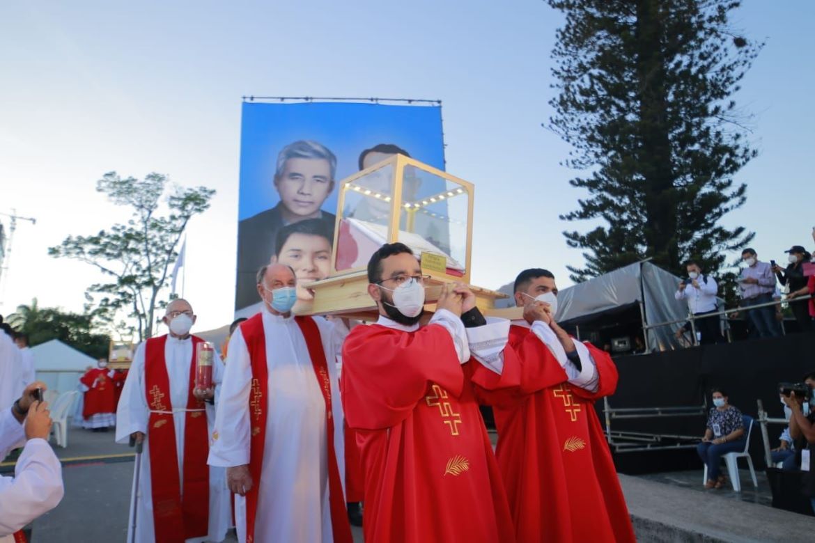 Acto seguido, se desplegó la gigantografía de los nuevos beatos en la plaza del Divino Salvador, y el cardenal Rosa Chávez recibió las reliquias de los mártires en el altar. Posteriormente los obispos y los postuladores de las causas agradecieron al papa Francisco por haber atendido su petición.