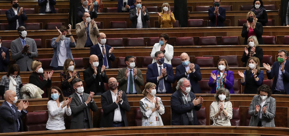 GRAF7564. MADRID, 17/12/2020.- Aplausos de los diputados del PSOE a la diputada Maria Luisa Carcedo, tras la aprobaciÛn este jueves en el pleno del Congreso de la proposiciÛn de ley que regular· la eutanasia. EFE/Kiko Huesca